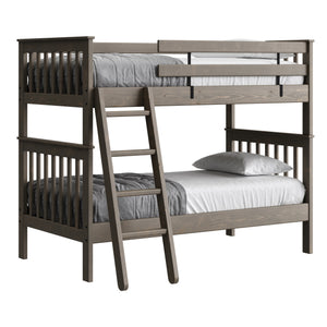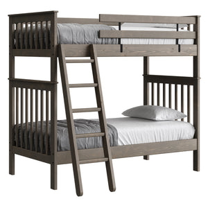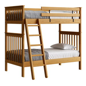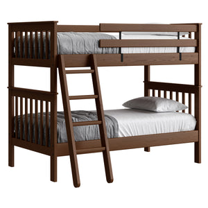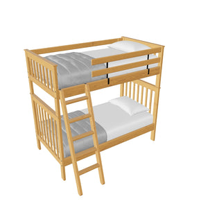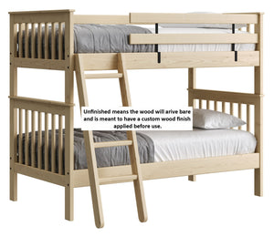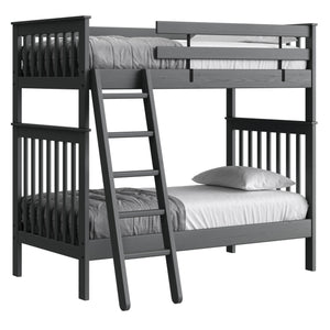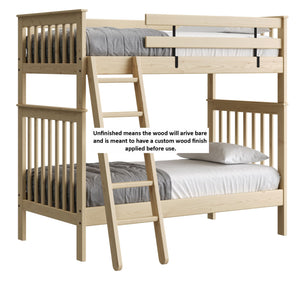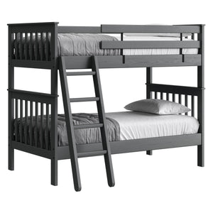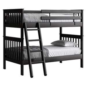 {"id":2170406830144,"title":"Mission Bunk Bed. Twin Over Twin.","handle":"mission-bunk-bed-twin-over-twin","description":"\u003cdiv class=\"so-accordion-wrapper\"\u003e\n\u003cdiv style=\"text-align: start;\" class=\"so-tab\"\u003e\n\u003cp\u003eMission bunk beds include a removable ladder that can be used on the front or ends of the bed. A full length rear guardrail and a removable front guardrail are included. The sturdy bed ends utilize \u003ca title=\"Mortise and tenon\" href=\"https:\/\/cdn.shopify.com\/s\/files\/1\/0128\/7661\/1648\/files\/Mortise_Tenon.jpg?v=1690230558\" target=\"_blank\"\u003emortise and tenon\u003c\/a\u003e construction and are all solid wood. \u003cbr\u003eOptions include extra-long for big kids and a taller version to allow 8” more headroom under the bed for comfortable seating. Can be separated into 2 beds or \u003ca rel=\"noopener\" title=\"Loft bed\" href=\"https:\/\/cratedesignsfurniture.com\/blogs\/blog\/how-to-turn-your-bunk-bed-into-a-loft-bed\" target=\"_blank\"\u003eset up as a loft bed.\u003c\/a\u003e\u003ca title=\"Bunk bed height\" href=\"https:\/\/cdn.shopify.com\/s\/files\/1\/0128\/7661\/1648\/files\/Bunk-height.jpg?600\" target=\"_blank\"\u003e\u003cimg style=\"margin-top: 10px; margin-bottom: 10px; float: start;\" src=\"https:\/\/cdn.shopify.com\/s\/files\/1\/0128\/7661\/1648\/files\/Bunk-height.jpg?600\" alt=\"Bunk bed height\"\u003e\u003c\/a\u003e\u003c\/p\u003e\n\u003cp\u003eThe top of an 8” thick mattress will be 21\" off the floor on the lower bed and 57” off the floor on the upper bed. (65” on Tall models). \u003cbr\u003e\u003cbr\u003e\u003cspan\u003eAdd optional drawers or a trundle bed for maximum use of your floor space.\u003c\/span\u003e\u003cspan\u003e \u003c\/span\u003e\u003ca title=\"Underbed storage\" href=\"https:\/\/cratedesignsfurniture.com\/collections\/under-bed-storage\" target=\"_blank\"\u003eView underbed options\u003c\/a\u003e\u003cspan\u003e.\u003c\/span\u003e\u003c\/p\u003e\n\u003cp\u003e\u003cspan\u003eReady for mattresses, no foundation required. \u003c\/span\u003e\u003ca title=\"Mattresses\" href=\"https:\/\/cratedesignsfurniture.com\/collections\/mattresses\" target=\"_blank\"\u003eView mattress options\u003c\/a\u003e\u003cspan\u003e. \u003c\/span\u003e\u003c\/p\u003e\n\u003c\/div\u003e\n\u003cdiv class=\"so-tab\"\u003e\n\u003cinput name=\"tabs\" type=\"checkbox\" id=\"so-tab-1\"\u003e \u003clabel for=\"so-tab-1\"\u003eDimensions\u003c\/label\u003e\n\u003cdiv class=\"so-tab-content\"\u003e\n\u003cp\u003e\u003cstrong\u003eTwin, regular:\u003c\/strong\u003e 43\" wide x 79\" deep x 65\" high. SKU: 4705 (Tall - 73\" high. SKU: 4705T)\u003cbr\u003e\u003cstrong\u003eTwin, extra-long:\u003c\/strong\u003e 43\" wide x 84\" deep x 65\" high. SKU: 4705Q (Tall - 73\" high. SKU: 4705TQ)\u003cbr\u003eThe ladder will extend 18\" from the front of the regular height bunk bed and 20\" from the front of the tall model.\u003cbr\u003e\u003c\/p\u003e\n\u003c\/div\u003e\n\u003c\/div\u003e\n\u003cdiv class=\"so-tab\"\u003e\n\u003cinput name=\"tabs\" type=\"checkbox\" id=\"so-tab-2\"\u003e \u003clabel for=\"so-tab-2\"\u003eMaterials\u003c\/label\u003e\n\u003cdiv class=\"so-tab-content\"\u003e\n\u003cp\u003e\u003cstrong\u003eFrame:\u003c\/strong\u003e Solid Southern Yellow Pine\u003cbr\u003e\u003cstrong\u003eMattress base:\u003c\/strong\u003e Solid Southern Yellow Pine slats (9) Foundation is not required\u003cbr\u003e\u003cstrong\u003eGuardrail \u0026amp; Ladder brackets:\u003c\/strong\u003e Powder coated steel\u003c\/p\u003e\n\u003cp\u003eAssembly required. Click for \u003ca href=\"https:\/\/cdn.shopify.com\/s\/files\/1\/0128\/7661\/1648\/files\/Mission_Bunk_Bed.pdf?v=1706197102\" title=\"Assembly instructions\" rel=\"noopener noreferrer\" target=\"_blank\"\u003eAssembly Instructions\u003c\/a\u003e\u003c\/p\u003e\n\u003c\/div\u003e\n\u003c\/div\u003e\n\u003cdiv class=\"so-tab\"\u003e\n\u003cinput name=\"tabs\" type=\"checkbox\" id=\"so-tab-3\"\u003e \u003clabel for=\"so-tab-3\"\u003eWarranty\u003cbr\u003e\u003c\/label\u003e\n\u003cdiv class=\"so-tab-content\"\u003e\n\u003cp\u003eWe guarantee that our furniture will have gaps and cracks, but will not fall apart for as long as you own it! Shipping charges for replacement parts are included during your first year of ownership. Foam, fabric and mechanisms (non-wood parts) are guaranteed against faulty workmanship for a period of one year from the date of delivery. As most mills do not guarantee their fabric we will not be held responsible for wear or fading of our products’ fabric. This guarantee is limited to the original purchaser \u0026amp; also limited to furniture used indoors under normal residential conditions only. Your invoice is your proof of purchase. \u003ca title=\"Commercial warranty\" href=\"\/pages\/about-us#guarantee\" target=\"_blank\"\u003eView commercial warranty terms.\u003c\/a\u003e\u003c\/p\u003e\n\u003c\/div\u003e\n\u003cdiv class=\"so-tab\"\u003e\n\u003cinput name=\"tabs\" type=\"checkbox\" id=\"so-tab-4\"\u003e \u003clabel for=\"so-tab-4\"\u003eShipping\u003c\/label\u003e\n\u003cdiv class=\"so-tab-content\"\u003e\n\u003cp\u003eThis item \u003cspan data-mce-fragment=\"1\"\u003equalifies\u003c\/span\u003e for \u003cstrong\u003efree\u003c\/strong\u003e shipping! \u003ca title=\"Shipping policy\" href=\"https:\/\/cratedesignsfurniture.com\/policies\/shipping-policy\" target=\"_blank\"\u003eView our shipping rates and policies.\u003c\/a\u003e\u003cbr\u003eShipping is unavailable to Newfoundland \u0026amp; Labrador, Northwest Territories, Nunavut, the Yukon and outside of Canada. If you require shipping in any of these areas use the \u003ca rel=\"noopener\" title=\"Store Locator\" href=\"https:\/\/cratedesignsfurniture.com\/pages\/store-locator\" target=\"_blank\"\u003eStore Locator\u003c\/a\u003e to find the closest dealer that services your area.\u003cbr\u003e\u003c\/p\u003e\n\u003c\/div\u003e\n\u003c\/div\u003e\n\u003c\/div\u003e\n\u003c\/div\u003e","published