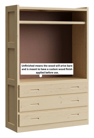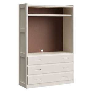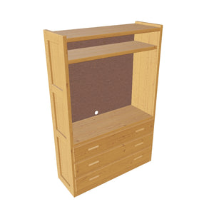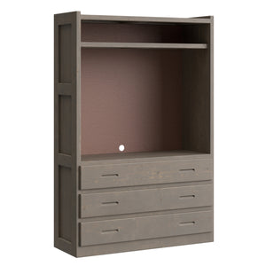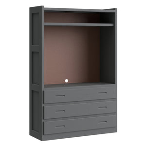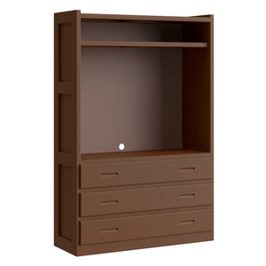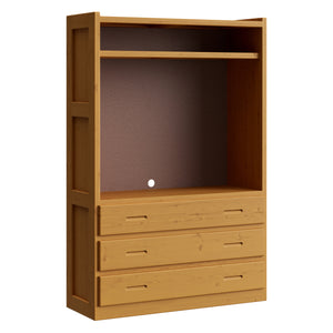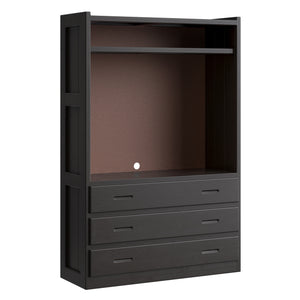 Open storage in the top and 3 drawers below. A shelf in the upper area will accomodate your electronics. Pair this unit with other pieces in the collection to create your perfect wall.
